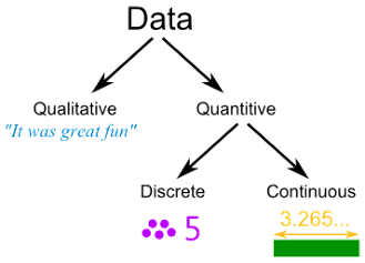 - Continuous data can take any value (within a range), For example, He weighs 25.5 kg. He is 565 mm tall.