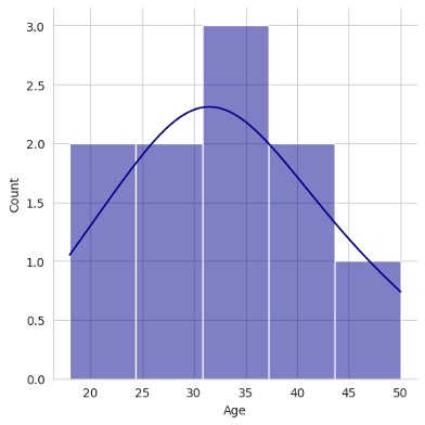 sns.displot(df['Age'].dropna(), kde=True, color='darkblue', bins=5)