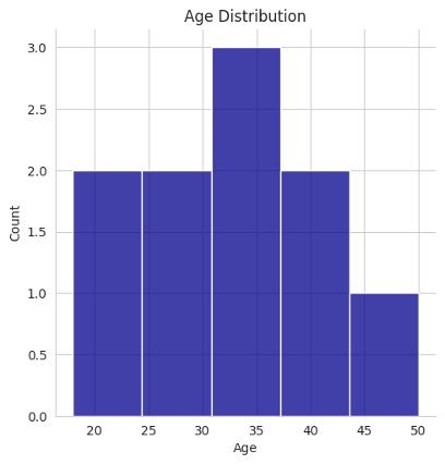 sns.displot(df['Age'].dropna(), kde=False, color='darkblue', bins=5)