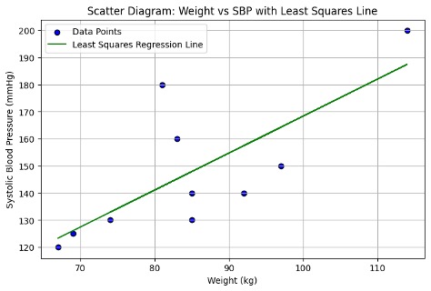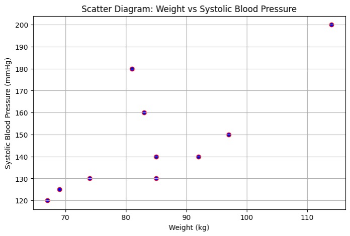 To creates a scatter diagram, each point showing one person’s (weight, blood pressure) pair. This helps visualize the relationship.