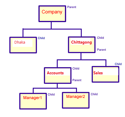 - One-to-many relationship: Data here is organised in a tree-like structure where the one-to-many relationship is between the datatypes. Example: In the above example, if we want to go to the node Manager1 we only have one path to reach there i.e throughChittagong and Accounts node.