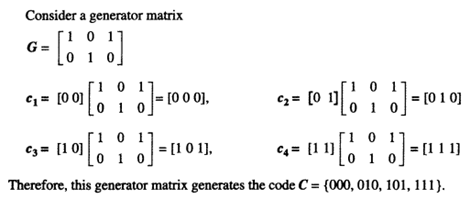 A defined matrix is called a generator matrix, G, which rows will be linearly independent. Thus, a linear combination of the rows can be used to generate the codewords of C. The generator matrix will be a k× n matrix with rank k.
