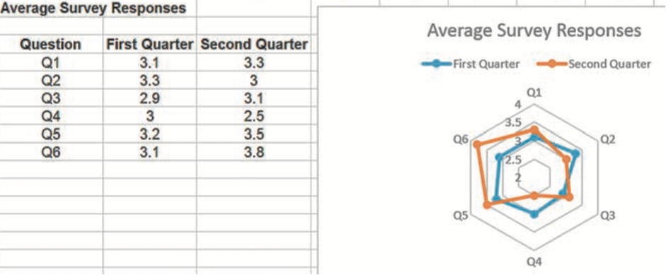 Radar Charts: Radar charts display several values on a spider-web-like shape. Each axis represents a different metric. They are useful for comparing data over time or for comparing the performance of different entities, like companies or factories, using the same criteria. Radar charts make it easy to see strengths and weaknesses at a glance.