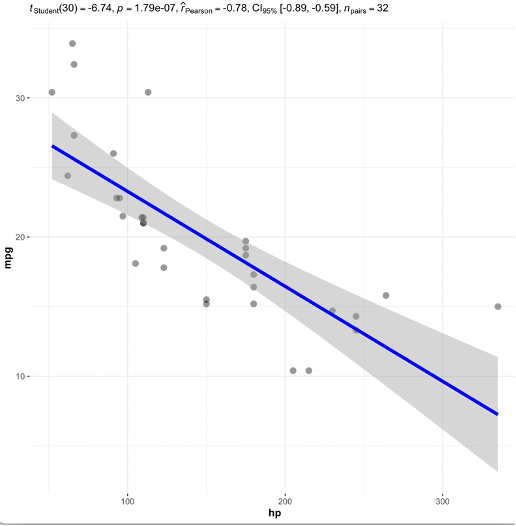 If we need to combine correlation and it’s test for hpand mpg in a plot then we can use the ggscatterstats() function from the {ggstatsplot} package.