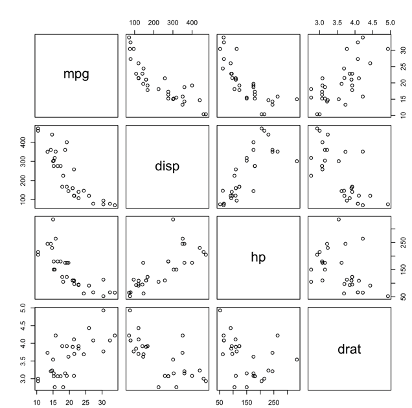 pairs(mtcars[, c("mpg", "disp","hp","drat")])