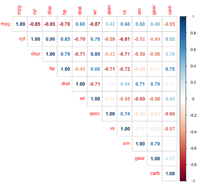 corrplot(cor(mtcars), method = "number", type = "upper" )